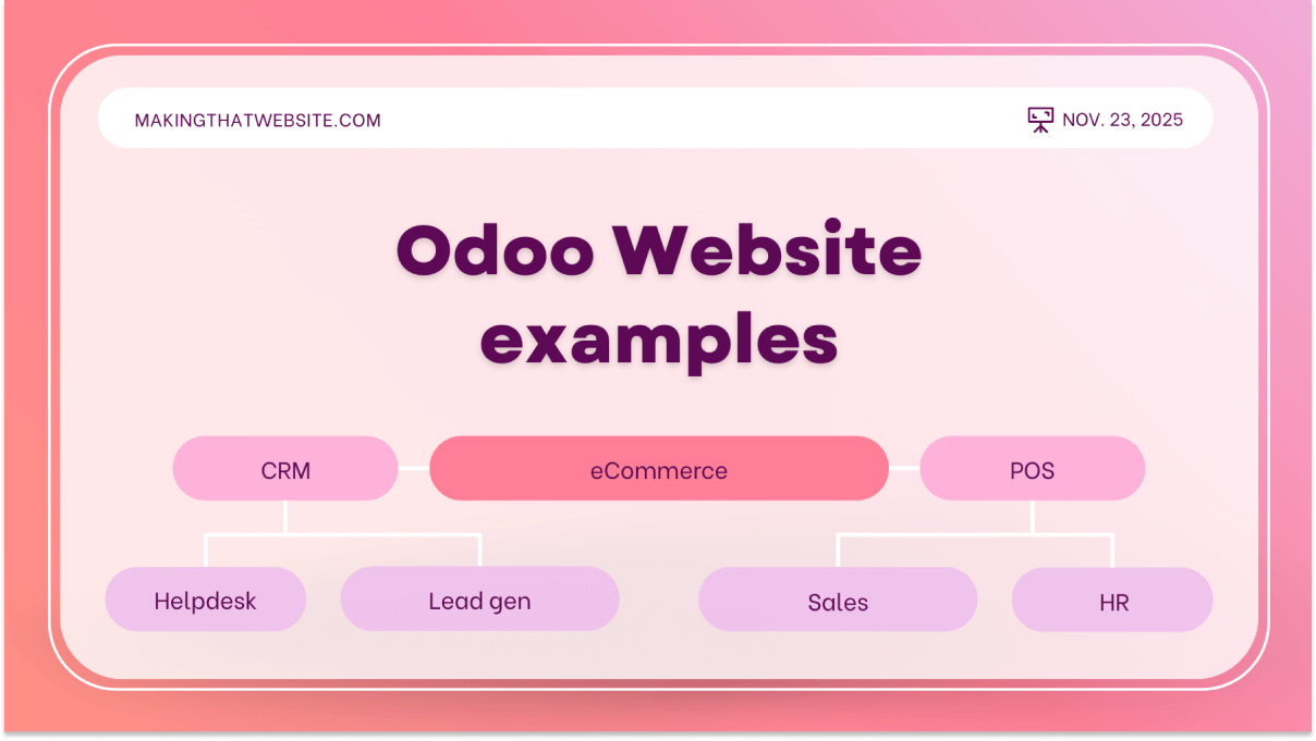 Examples of Real-world websites built on Odoo. For example: A marketing site that directly integrates with a CRM, eCommerce store, membership site, landing pages, and more.